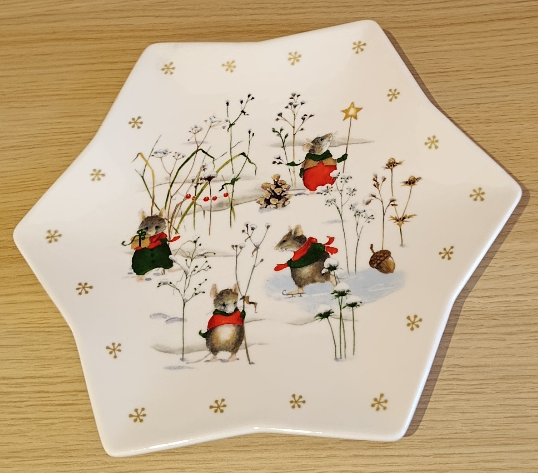 Der liebevoll gestaltete Gebäcksteller zeigt ein winterliches Motiv mit kleinen Mäusen, Tannenzapfen und feinen Blüten. Perfekt geeignet, um Weihnachtsplätzchen, Gebäck oder andere Leckereien stilvoll zu servieren.